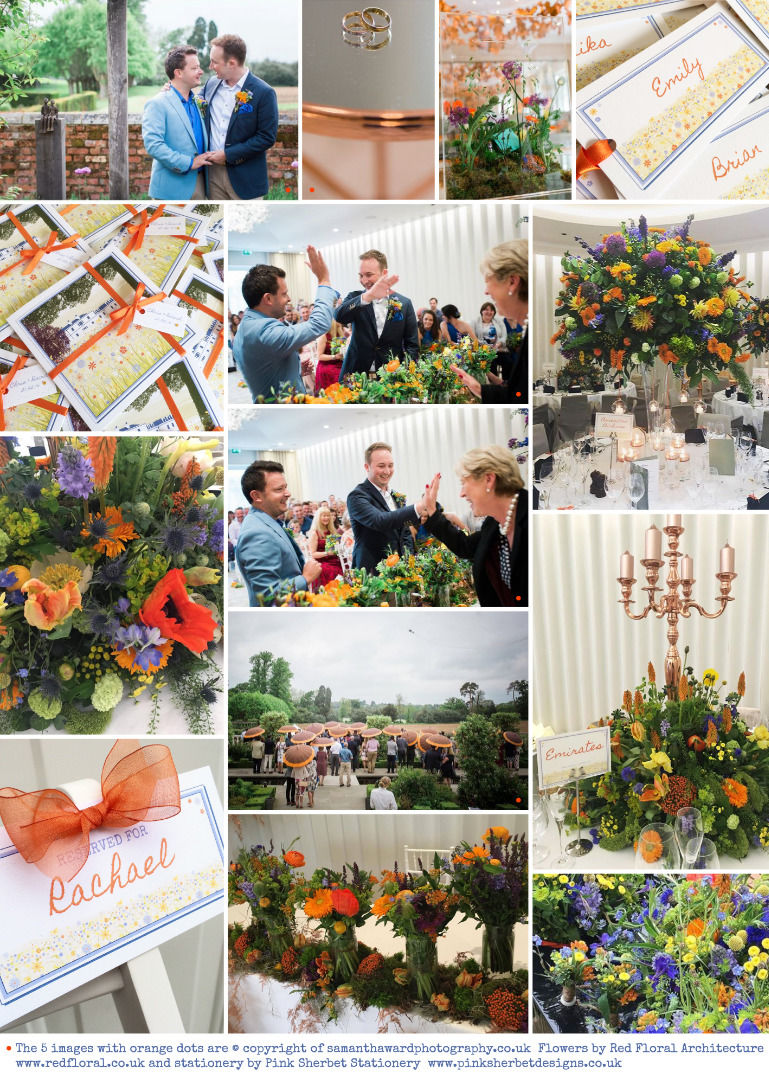 As the elegant interior decor of the venue features touches of orange, Chris and David were keen for this colour to make and appearance on their invitations and stationery. We combined the venue, the wildflowers and their colours with touches of the venue's orange creating the perfect design... Chris and David loved it!